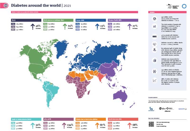 Factsheets Factsheets with global and regional data from the IDF Diabetes Atlas 10th Edition are available for download below. Diabetes around the world in 2021enDiabetes in Africa in 2021enDiabetes in Europe in 2021enDiabetes in Middle-East and North Africa in 2021enDiabetes in North America and Caribbean in 2021enDiabetes in South and Central America in 2021enDiabetes in South-East Asia in 2021enDiabetes in Western Pacific in 2021en